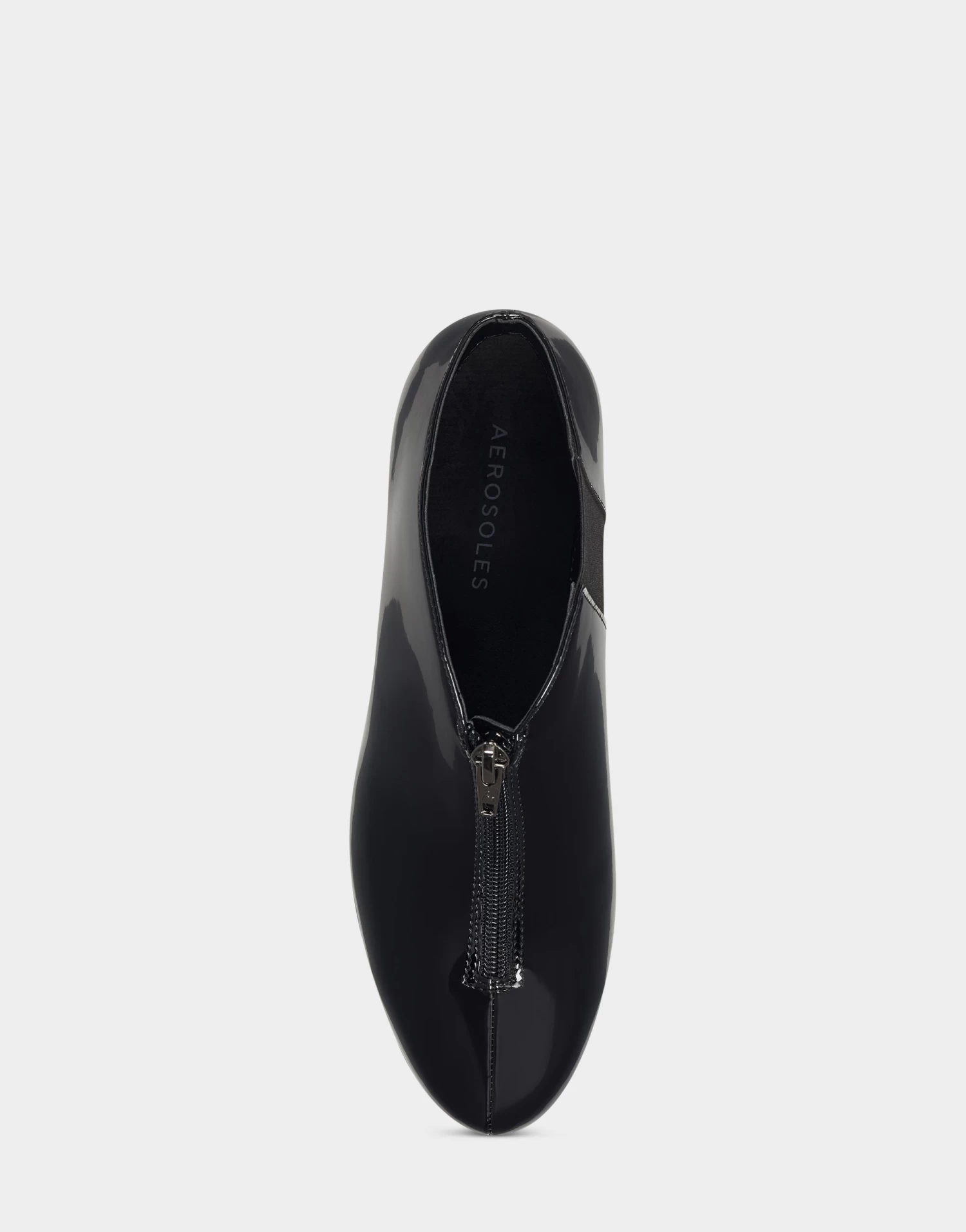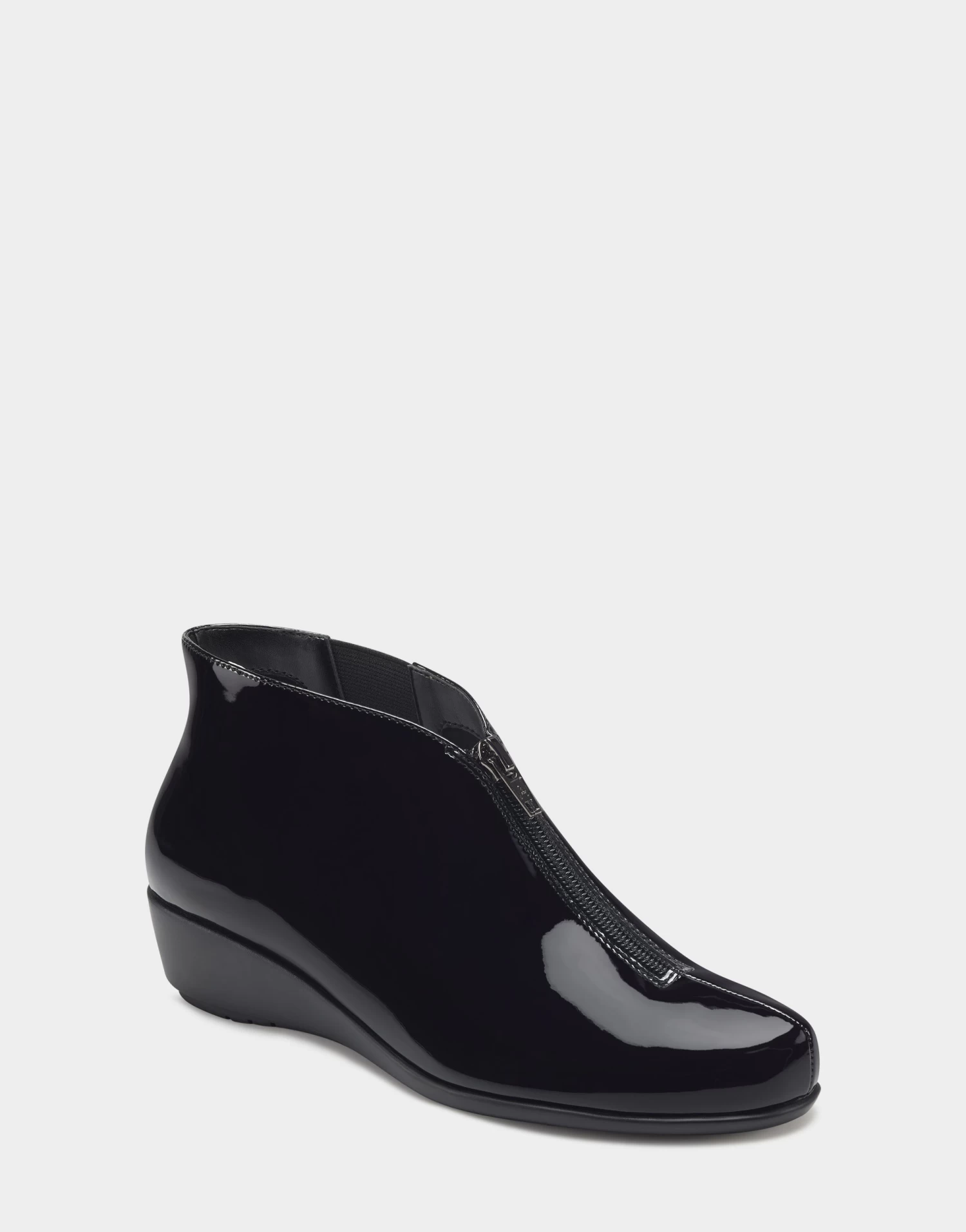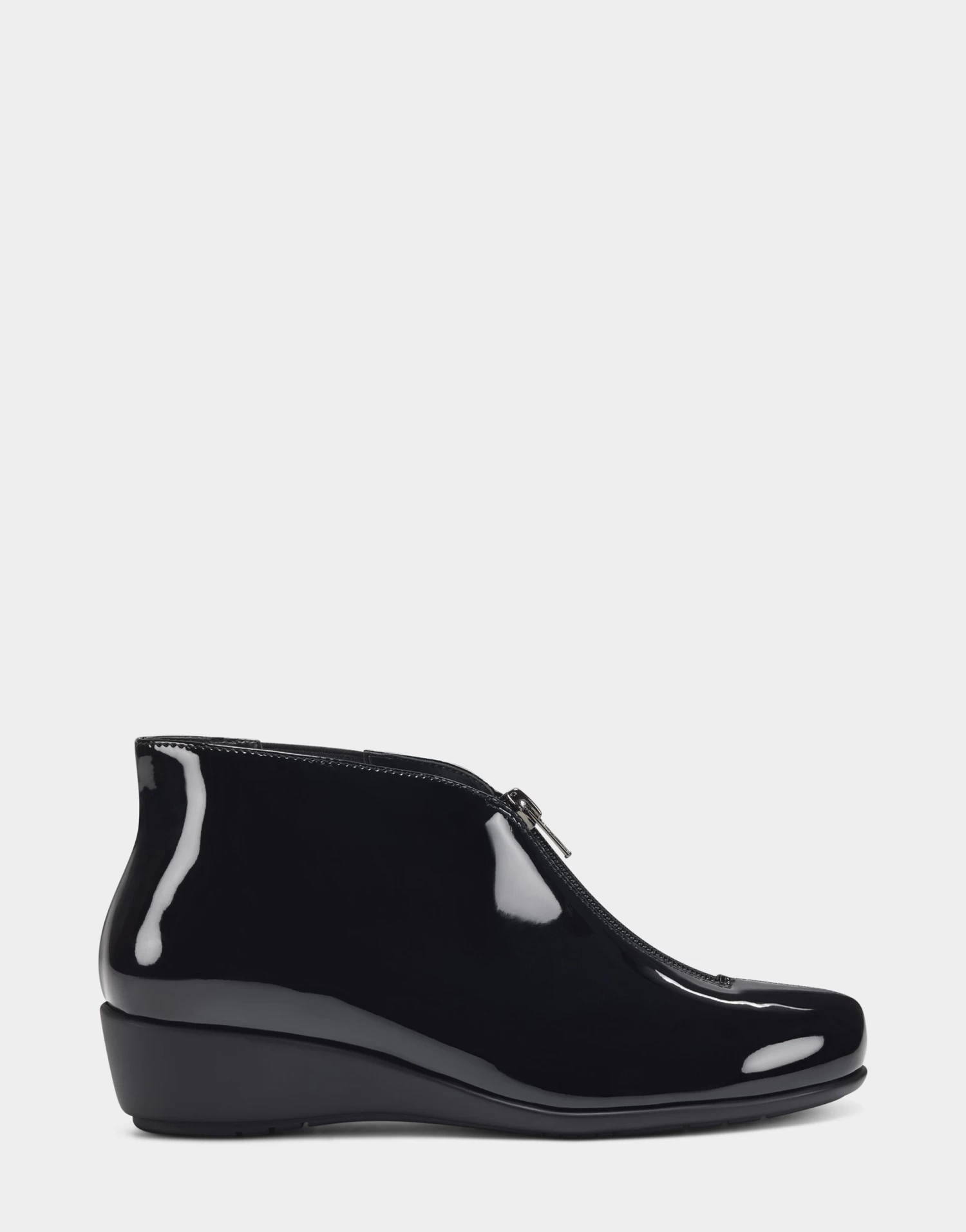 New for Fall 2022 in gorgeous glossy patent, this ankle bootie is a staple that endures. Wear it with a pair of slim-fitting jeans or a smart skirt. The wedge heel is stable enough for power-walking through your day.ย