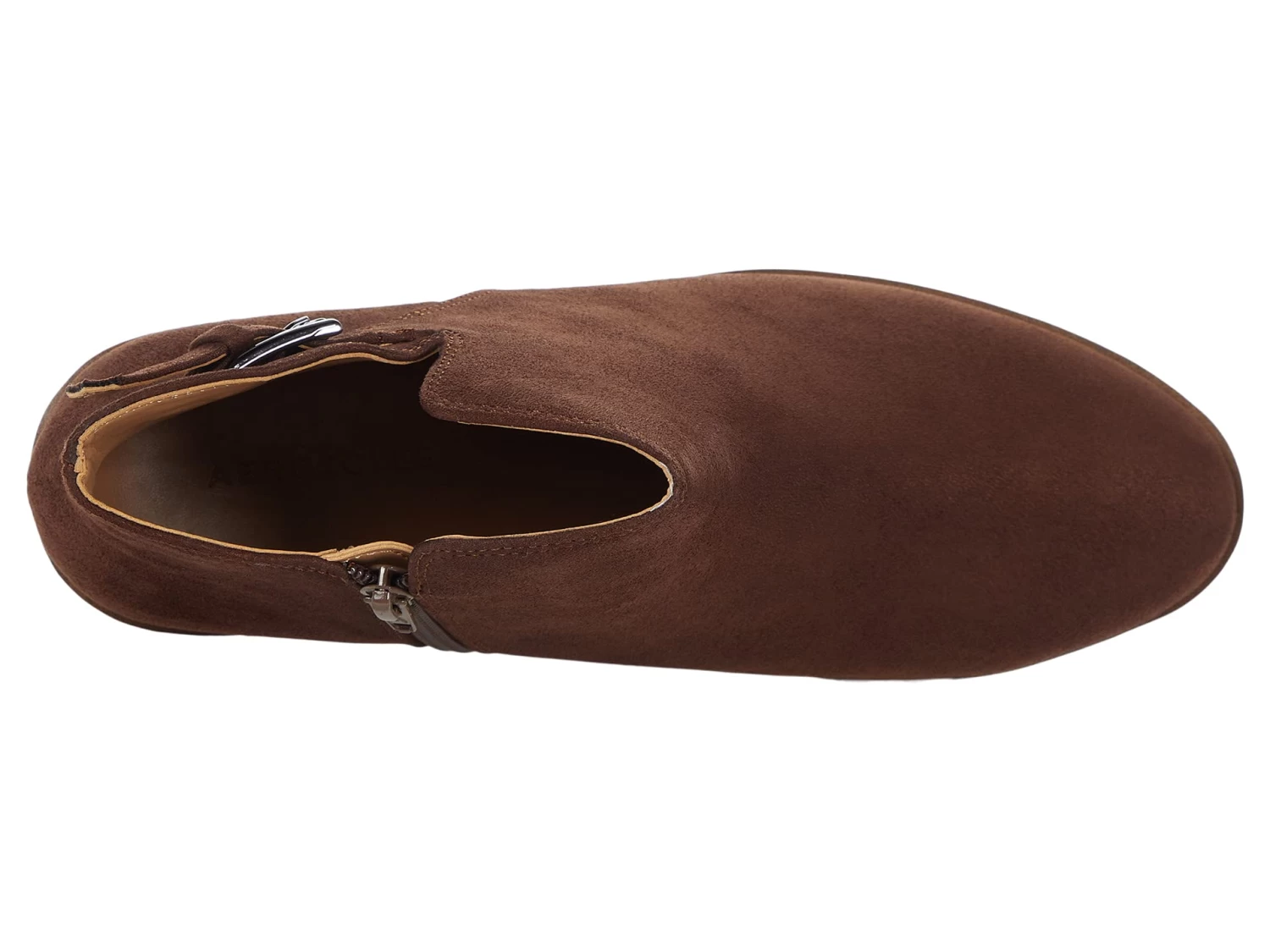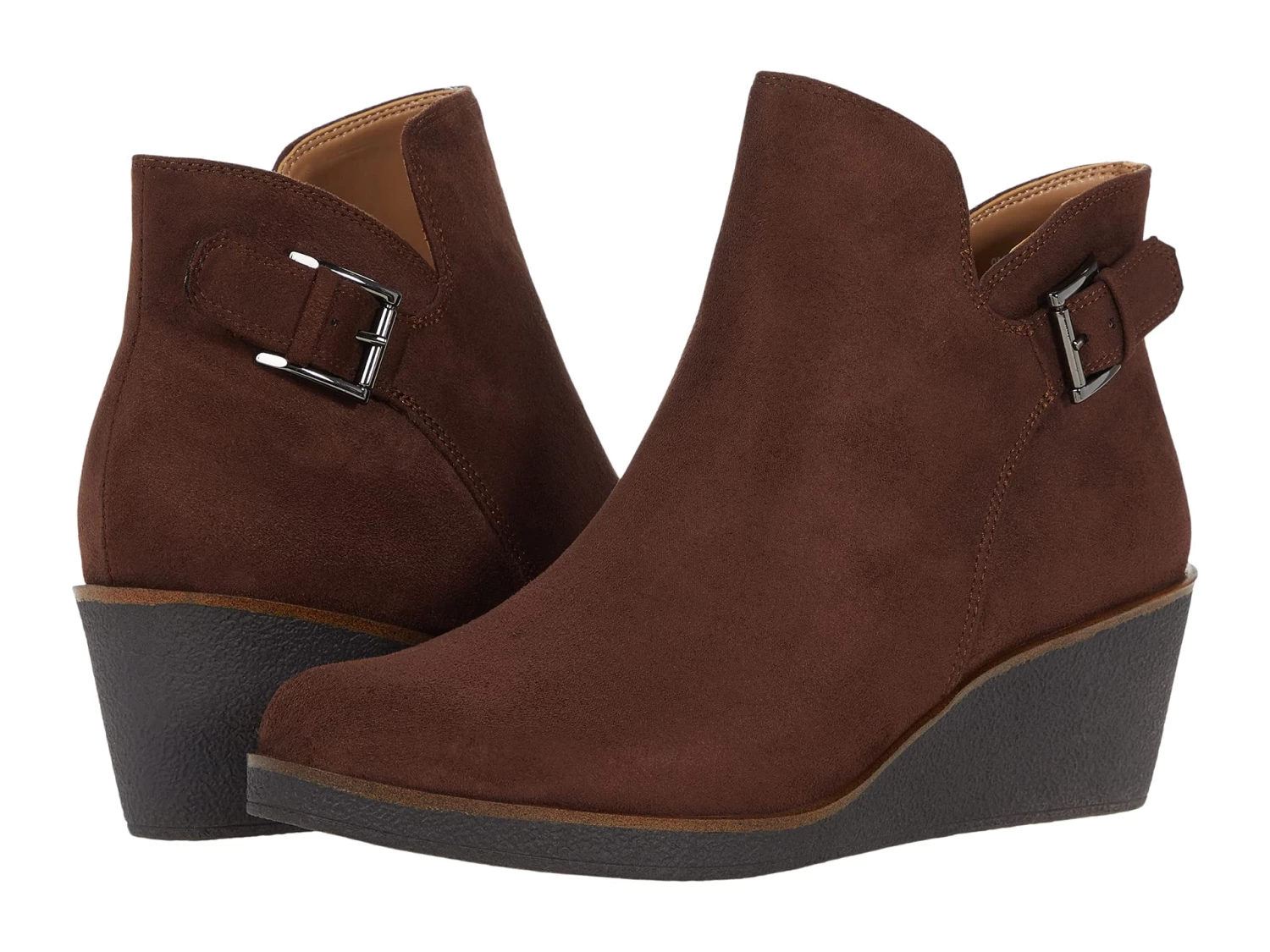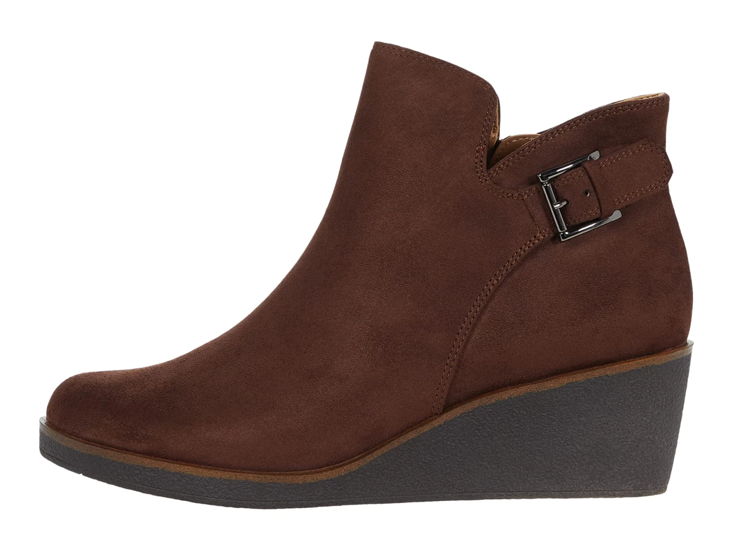 - Ankle boot silhouette with almond toe design and wedge heel.