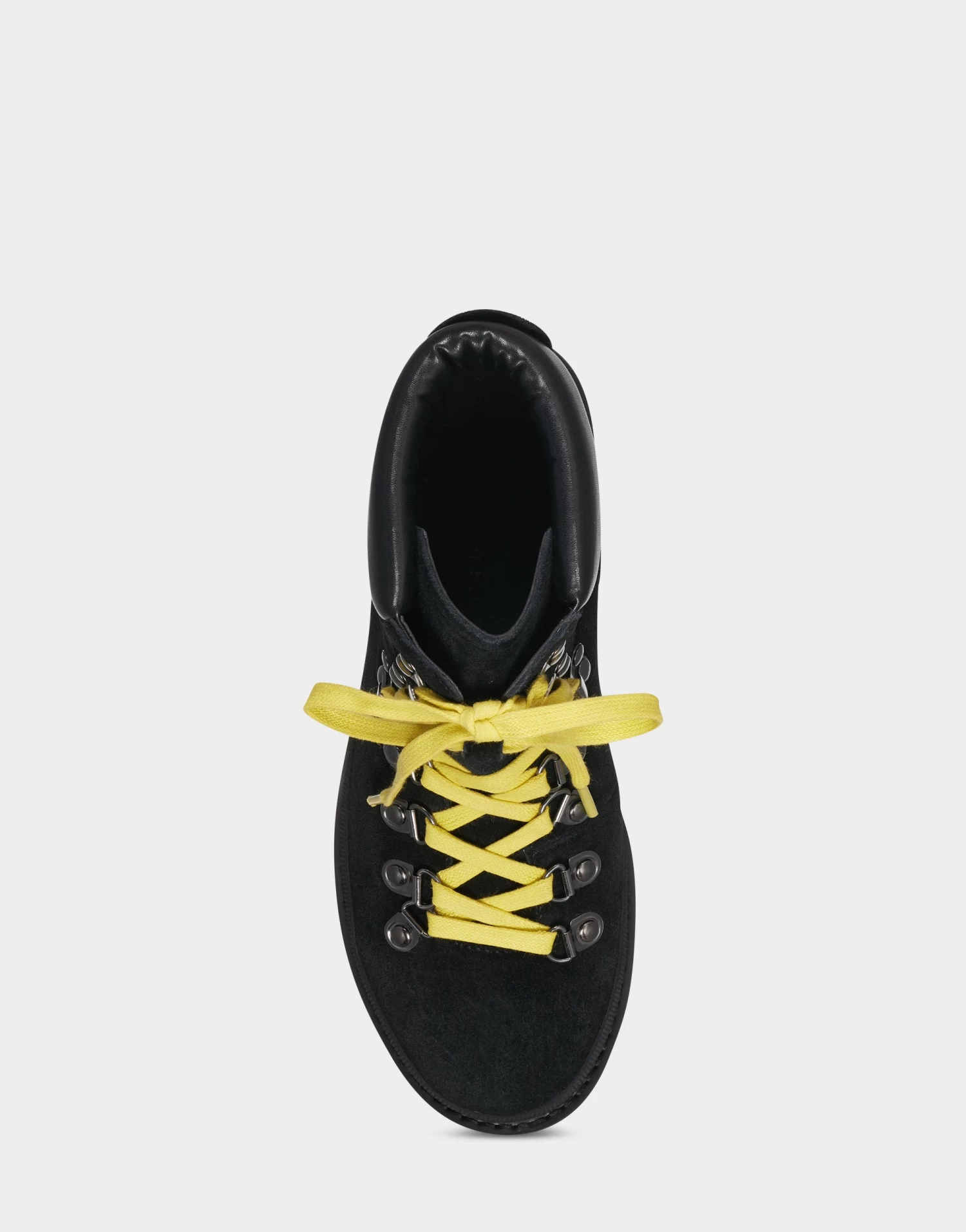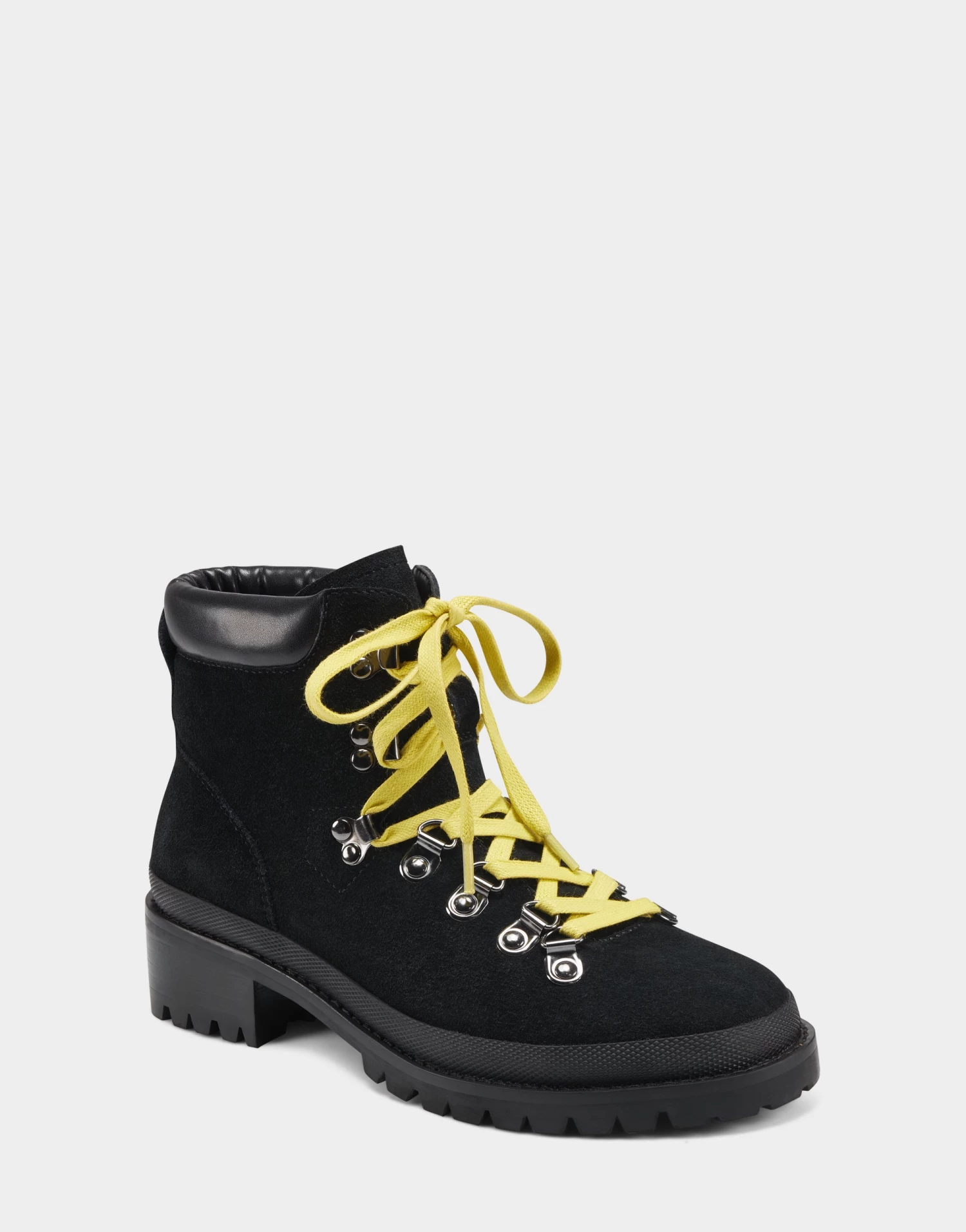 Look on the bright side! Vibrant yellow laces enliven the Cruz, accented by gunmetal speed hooks. Soft suede enhances the look, complemented by sturdy lug soles and a stacked heel. A hiking boot designed for the urban landscape, it pairs perfectly with jeans or leggings as part of a laid-back weekend outfit.ย