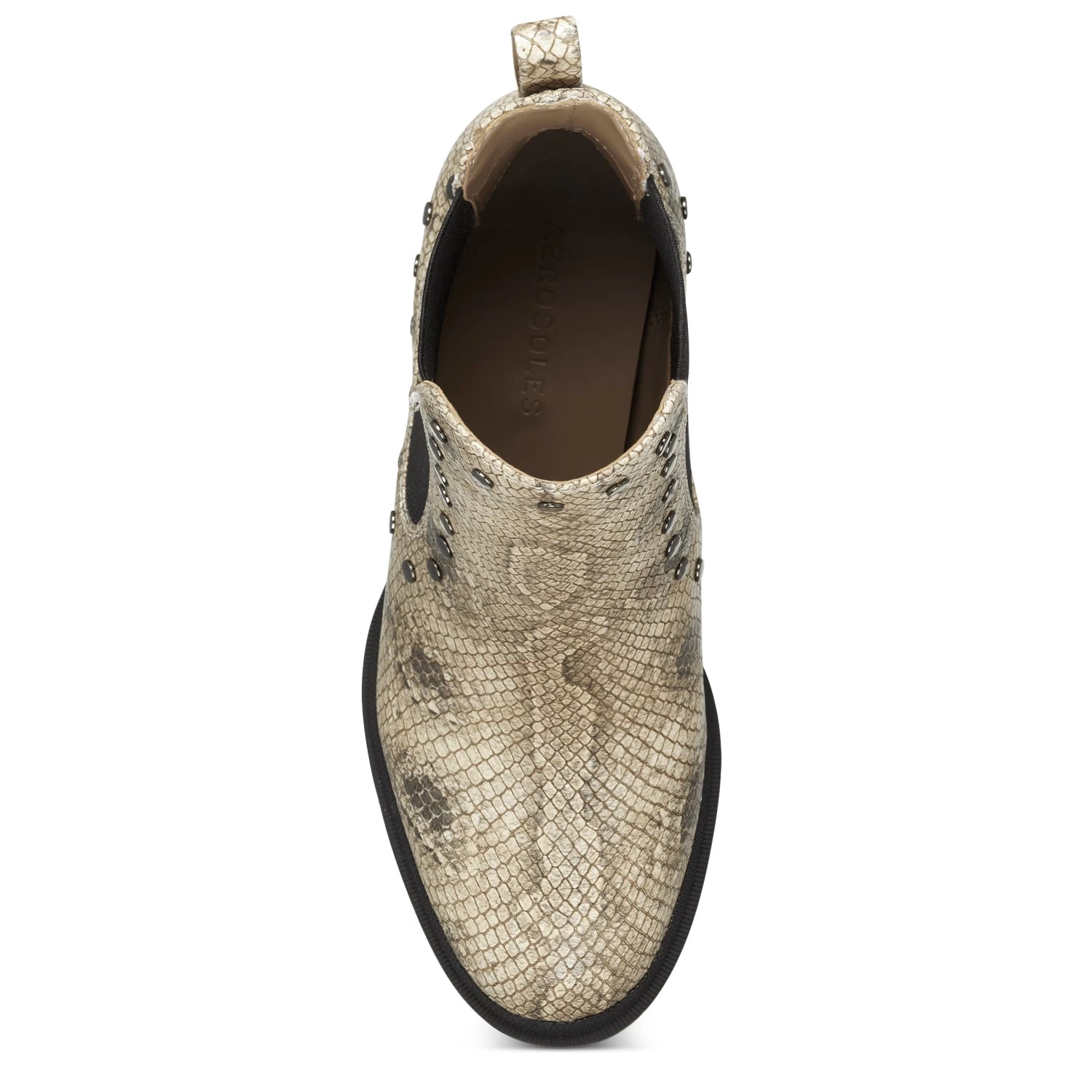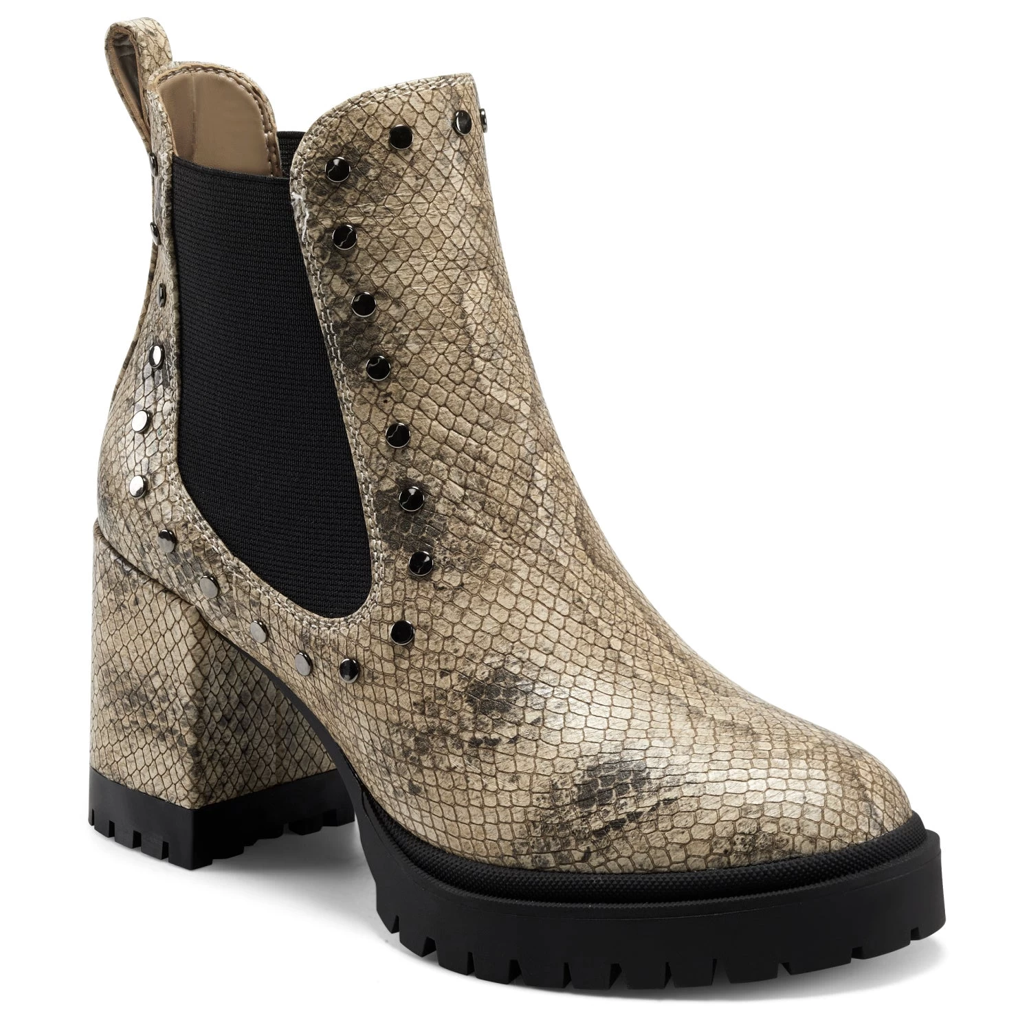Timeless design with a definite downtown edge: a high stacked heel and sturdy lug sole stand out on the Emelia, our leather ankle boot. Polished studs and a striking snake print amp up the cool factor. Elastic goring on the sides ensures ease of wear. 3″ Heel. Leather Upper, balance Synthetic Materials.