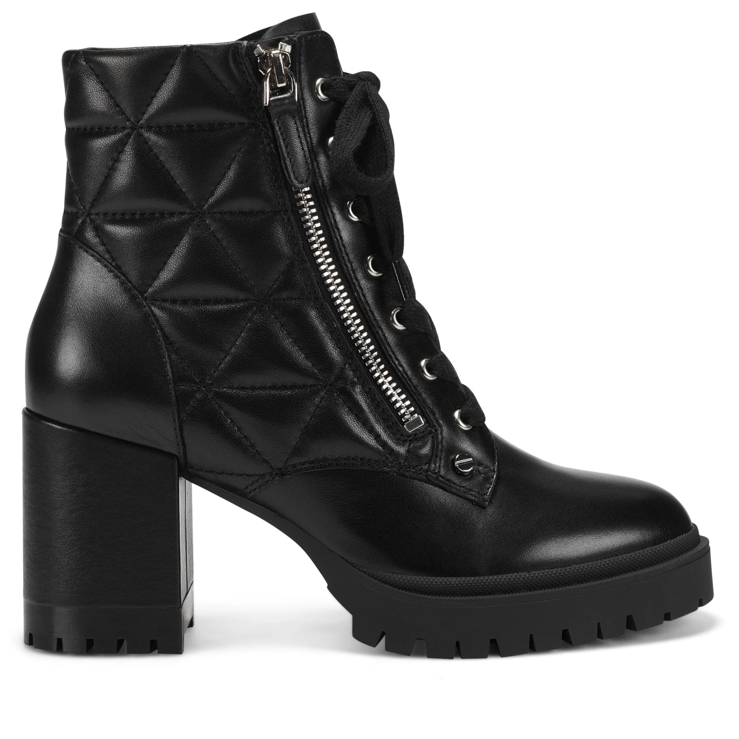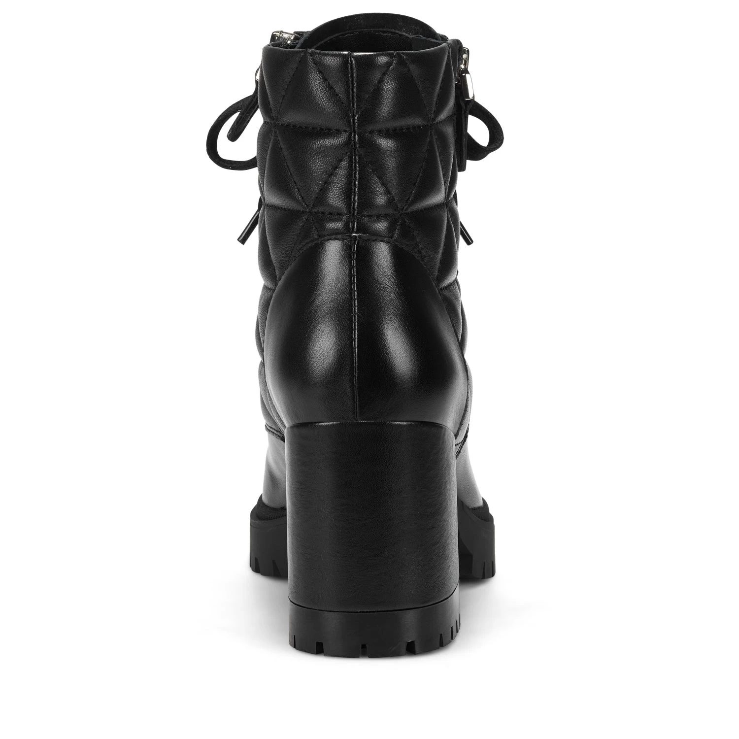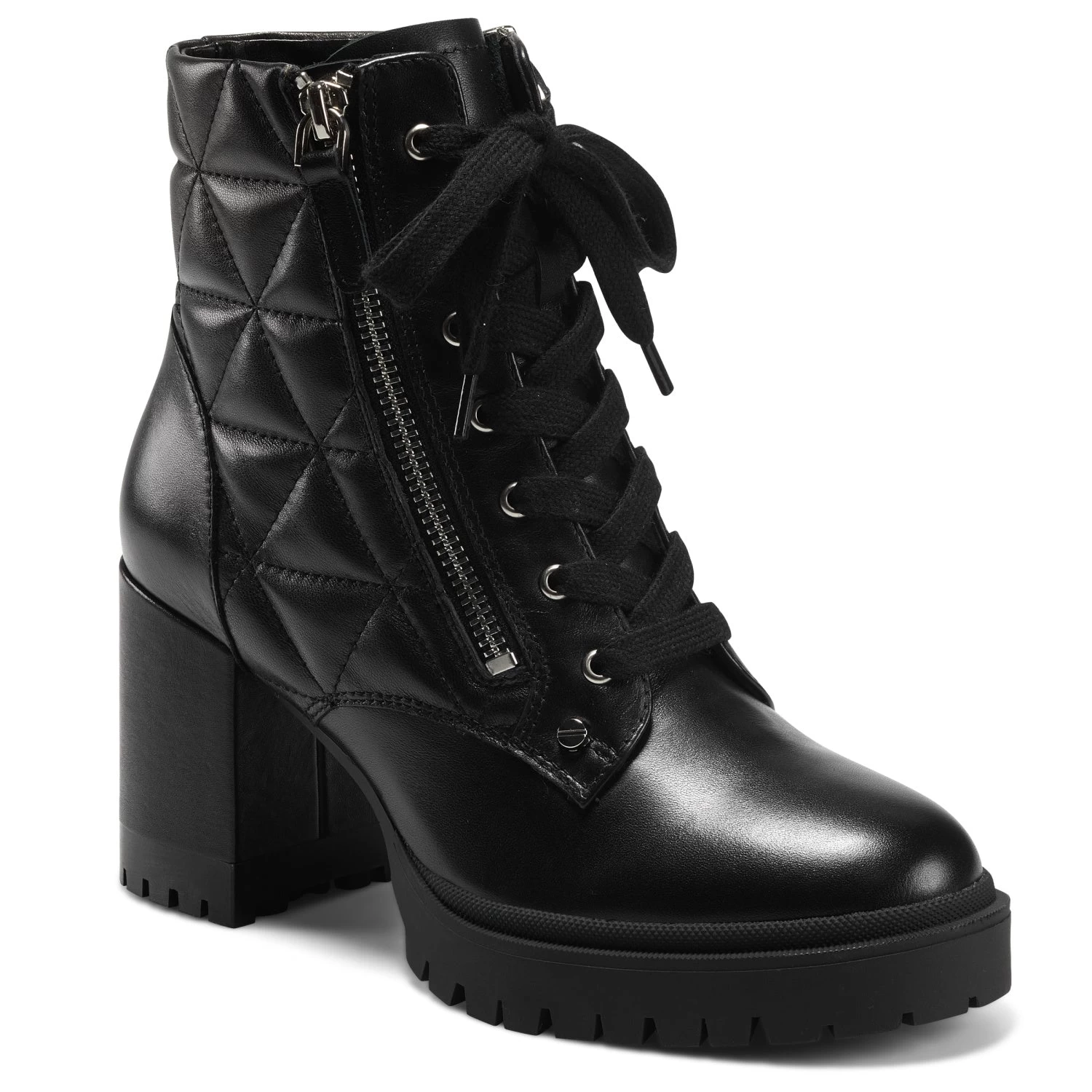 Lug soles toughen up the Essa lace-up ankle boot, finished with a zipper closure. Plush quilting enhances the lookโa chic complement for everything from tailored trousers to jeans. 3 1/4″ Heel. Leather Upper, balance Synthetic Materials.