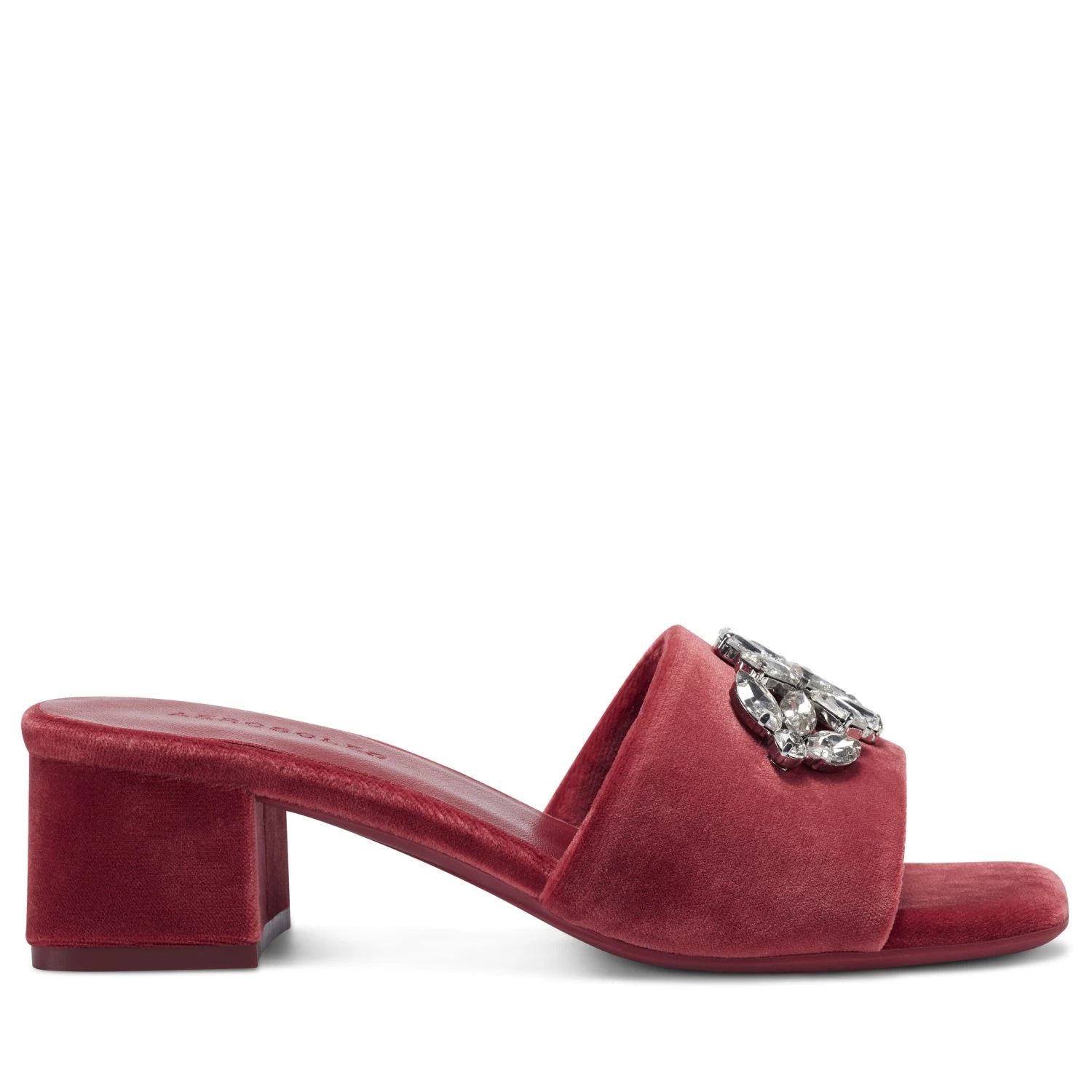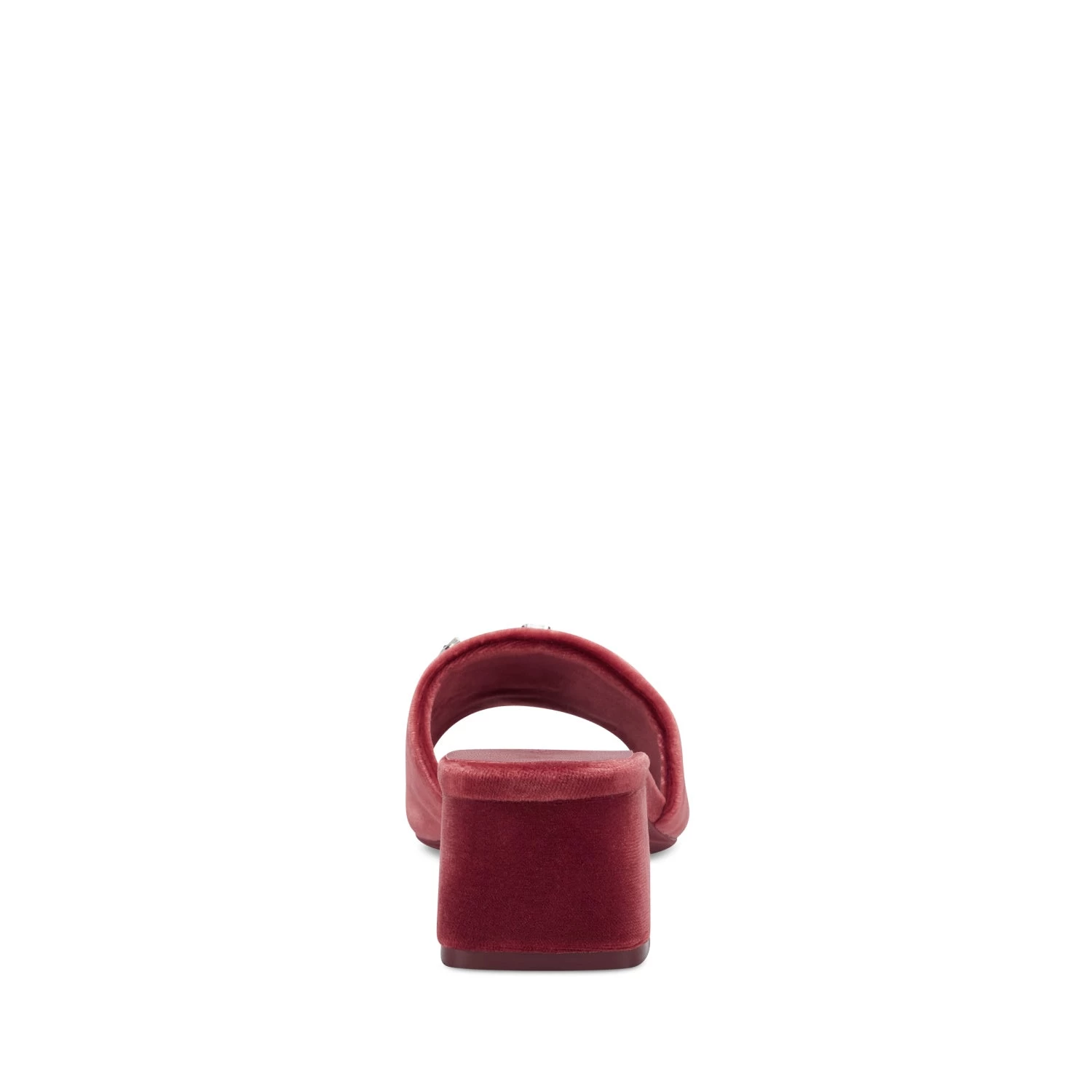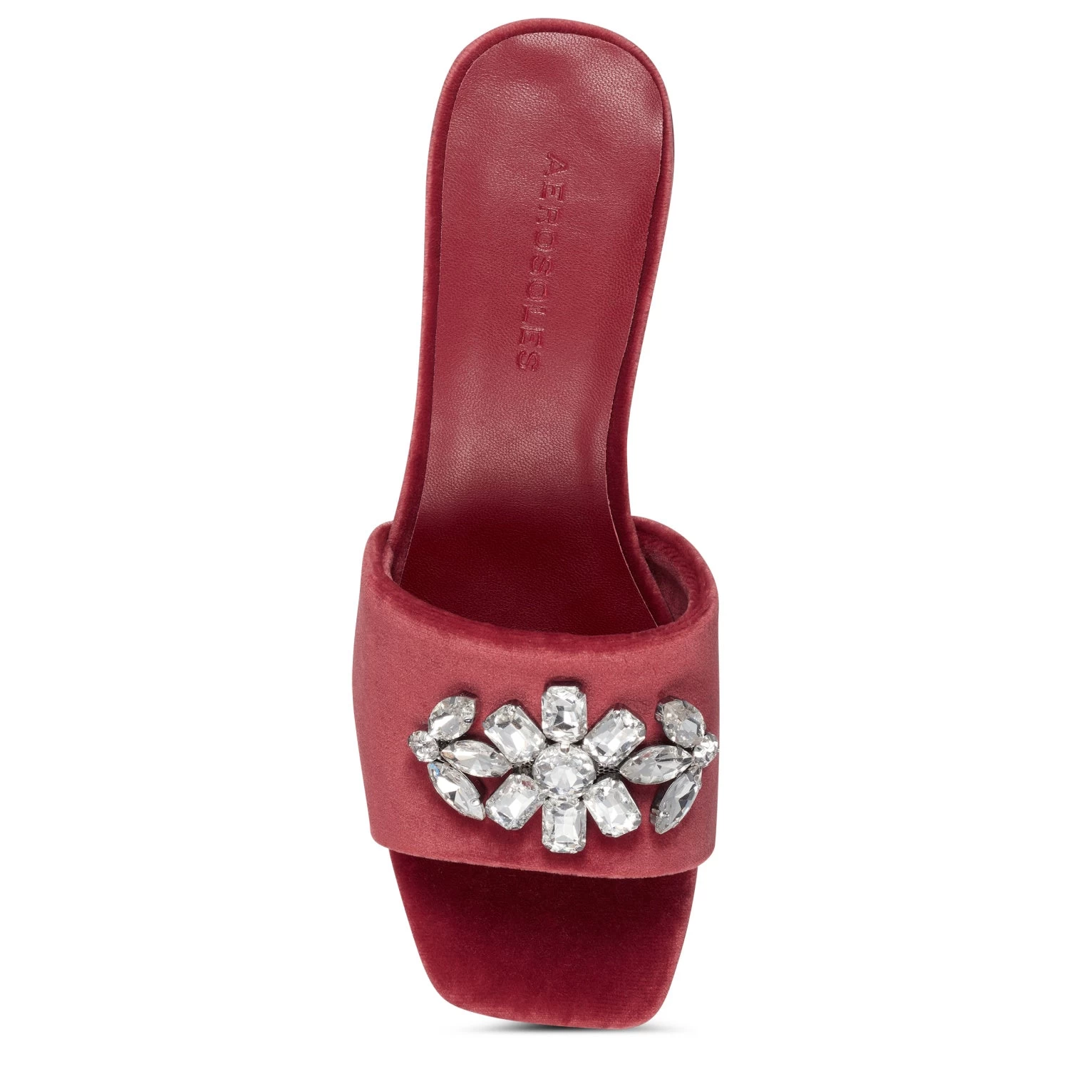 Effortless elegance: Slide sandals take a luxe turn with the Eventi, crafted in plush velvet with covered block heels. Sparkling rhinestones in a floral composition add an ultra-glam accent. 1 3/4″ Heel. Velvet Upper, balance Synthetic Materials