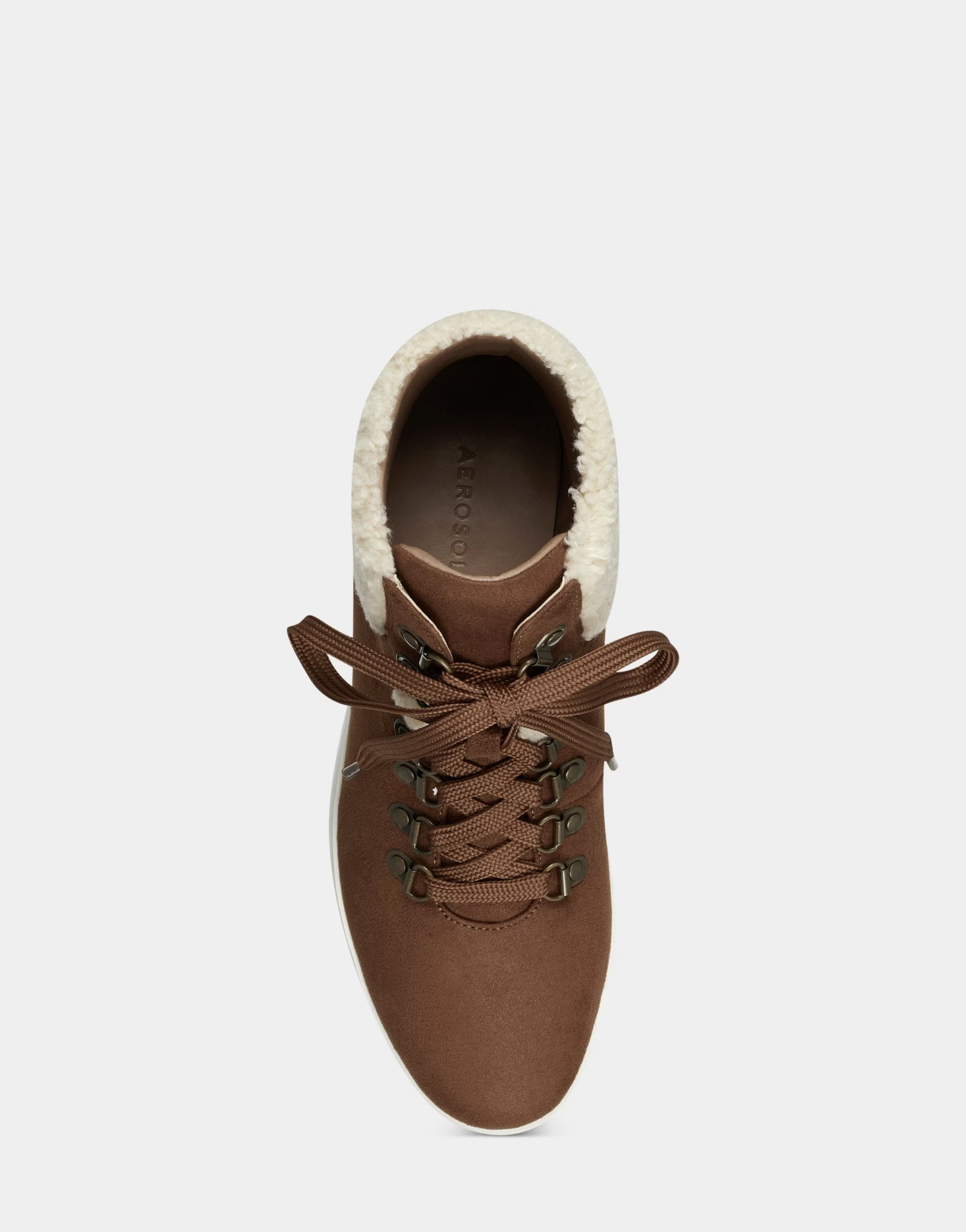 Cozy meets chic: Designed in soft faux suede, the Frankie lace-up boot is accented by plush shearling trim. A rugged yet style-conscious choice for your off-duty look. 1 1/4″ Heel. All synthetic materials.ย