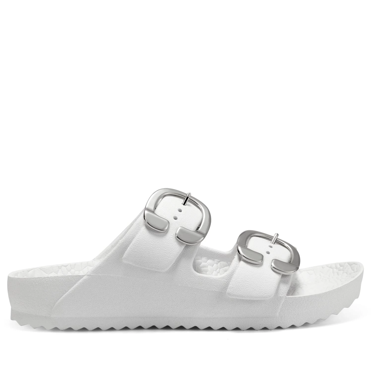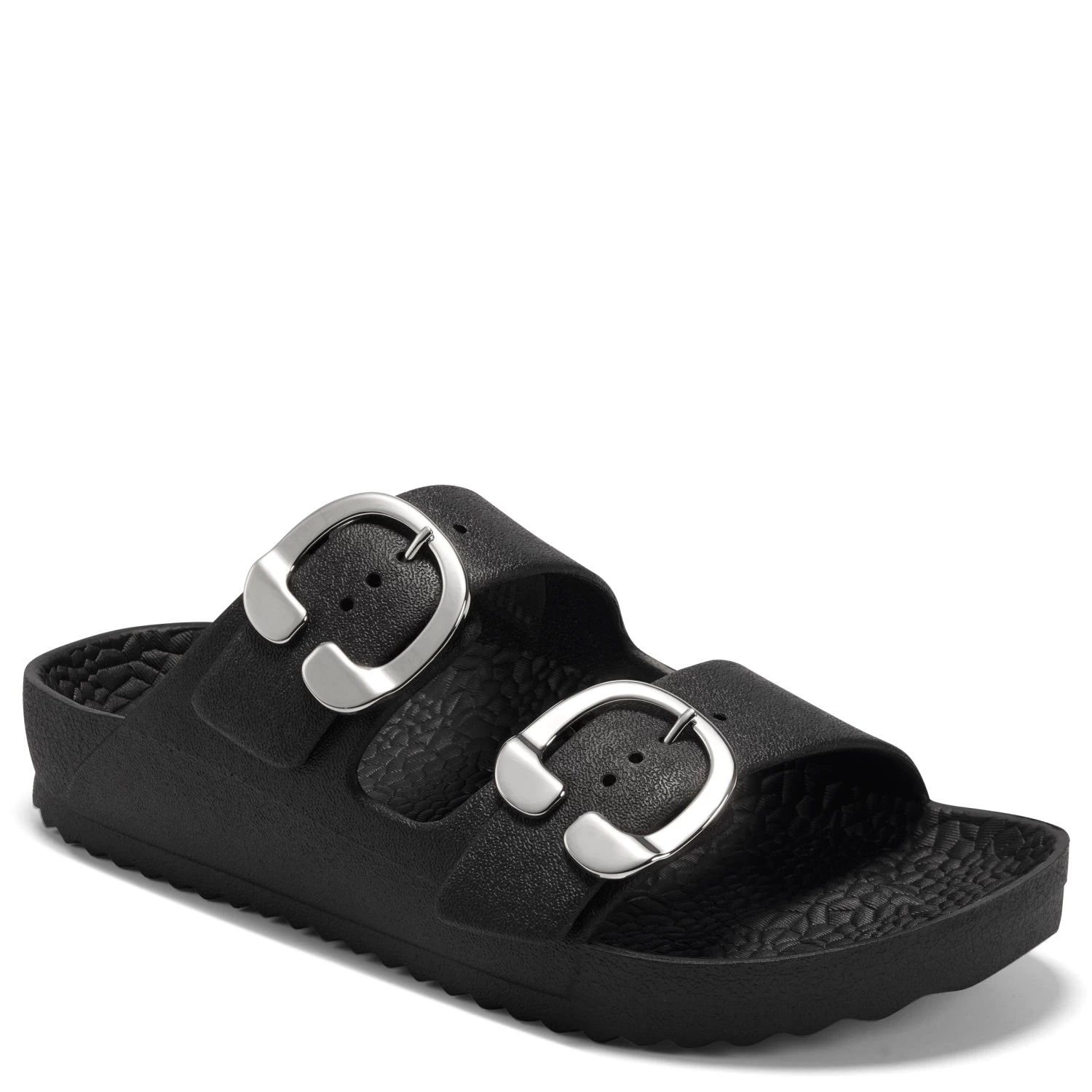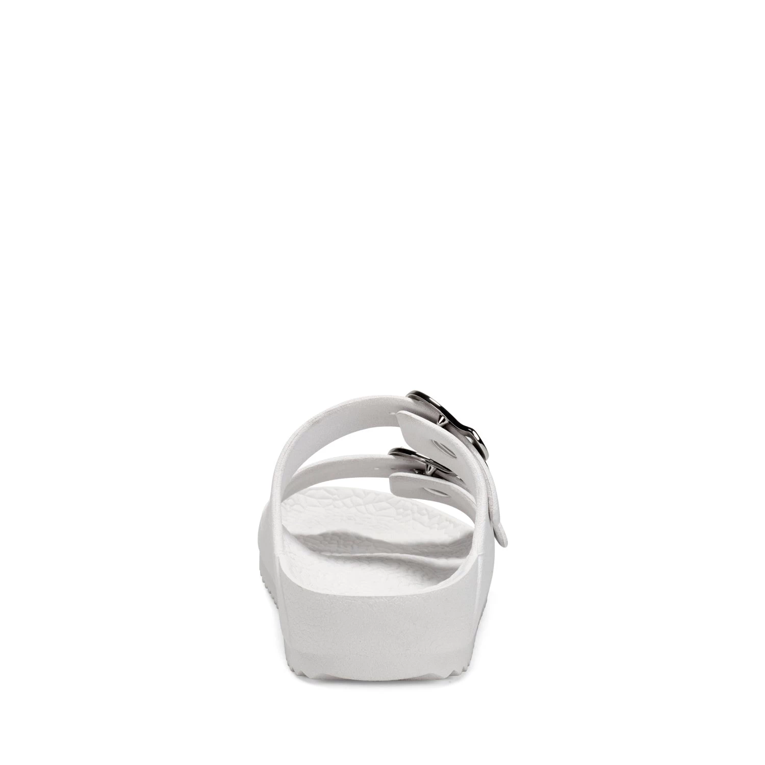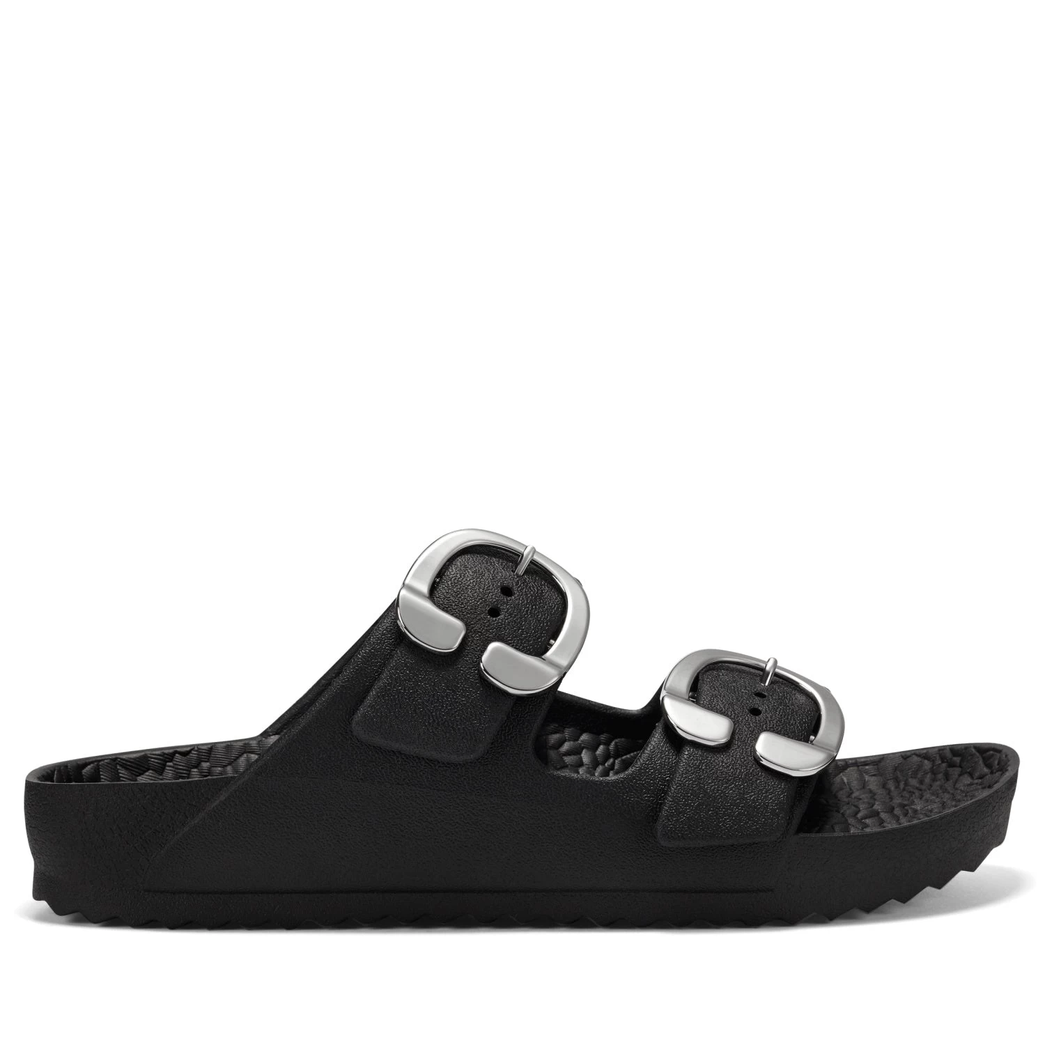 - Oversized new signature buckles make this timeless yet trendy EVA slide this season’s essential. A molded footbed and slip-on design ensure unlimited comfort and ease of wear, making it a go-to look for your off-duty style. 1/2″ Heel. EVA Upper, balance Synthetic Materials.