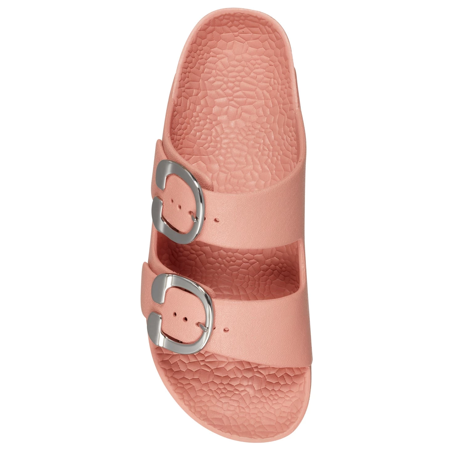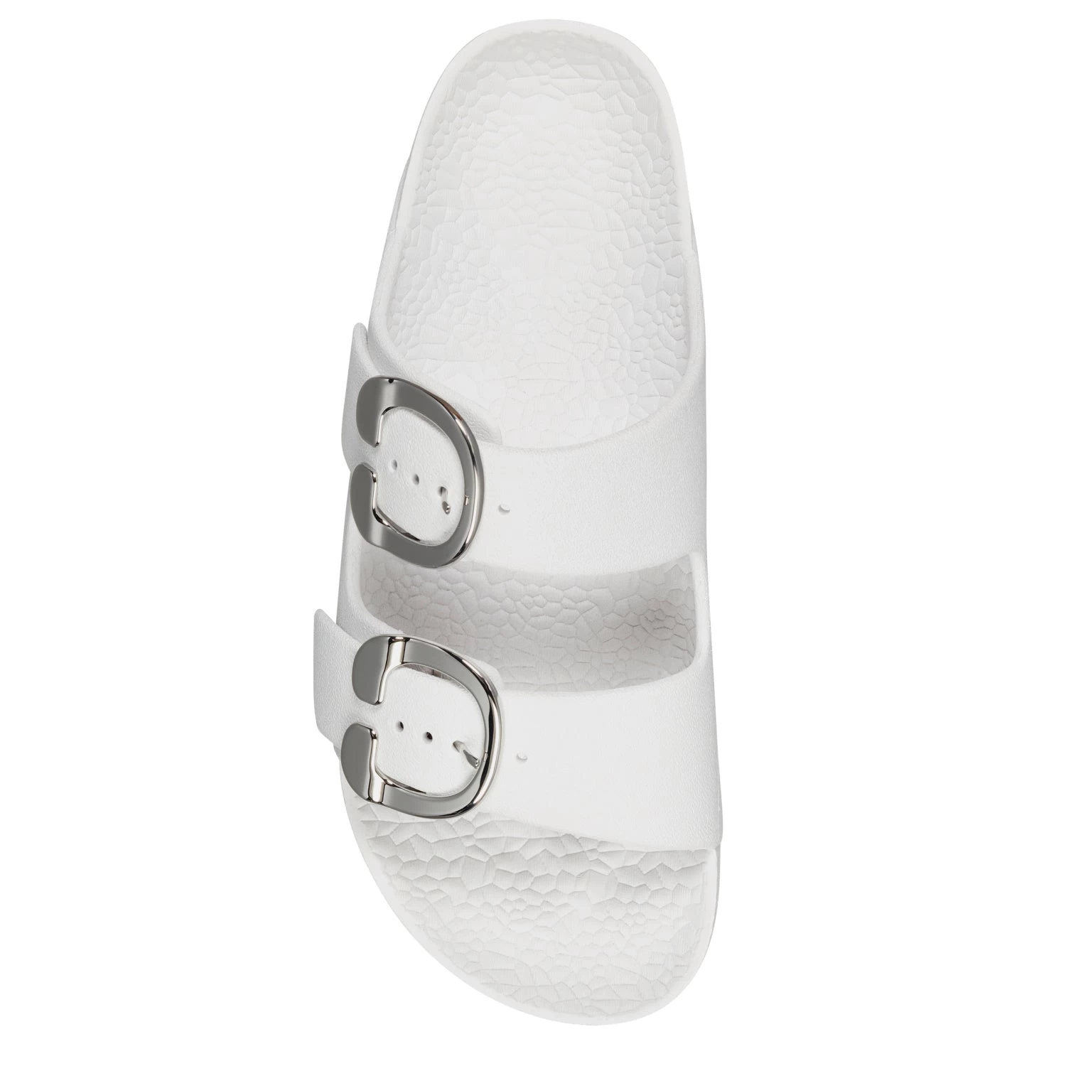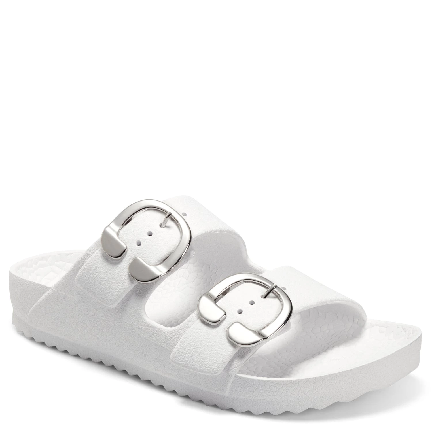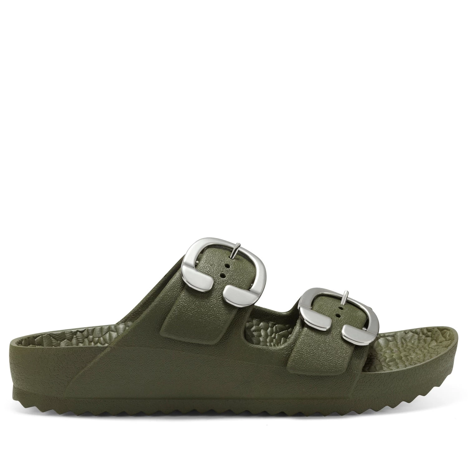 - Oversized new signature buckles make this timeless yet trendy EVA slide this season’s essential. A molded footbed and slip-on design ensure unlimited comfort and ease of wear, making it a go-to look for your off-duty style. 1/2″ Heel. EVA Upper, balance Synthetic Materials.