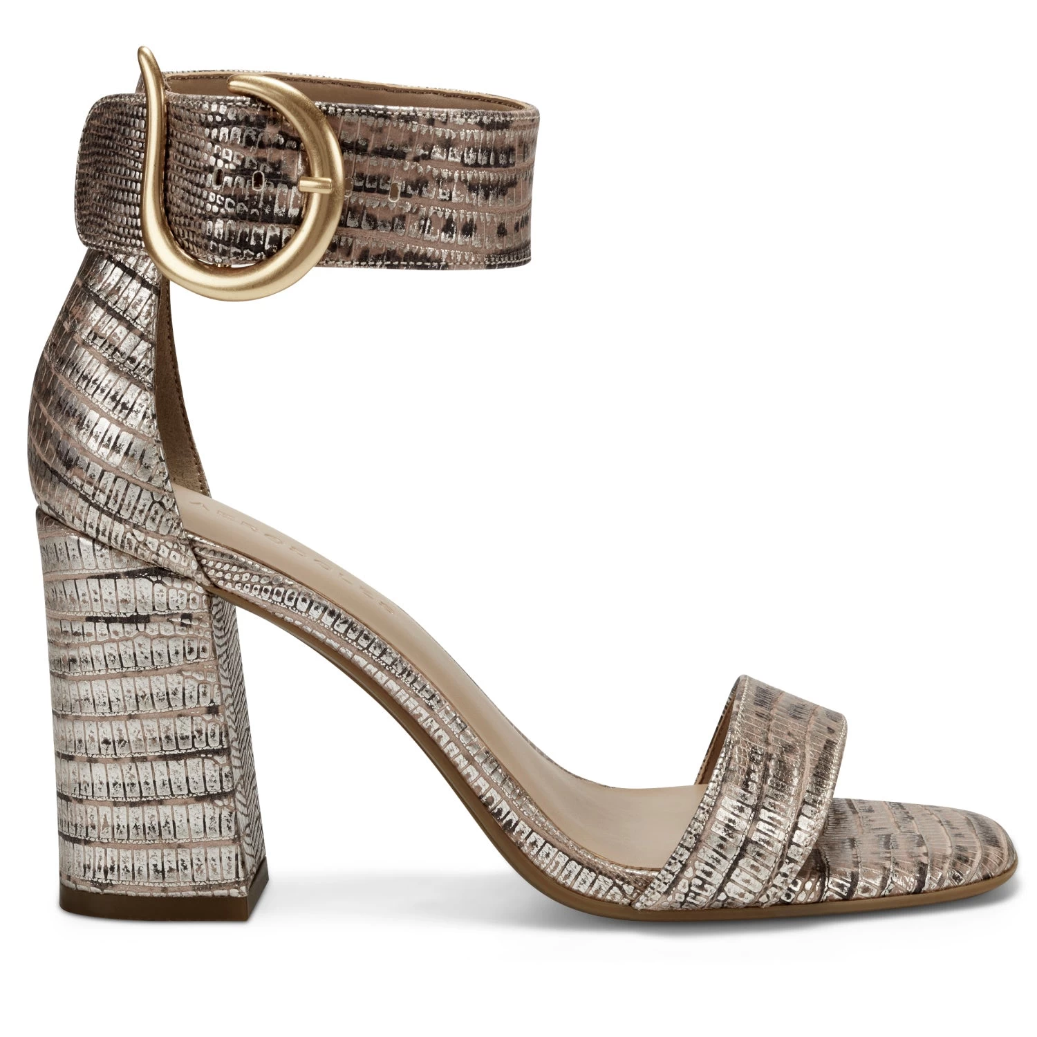 - A knockout look for your next night out: a double-strap silhouette and polished gold tone buckle set apart the Landon, our sophisticated sandal finished with a high block heel. The ultimate compliment to your favorite LBD. 3 1/4″ Heel Height. Leather Upper, Balance Synthetic Materials.