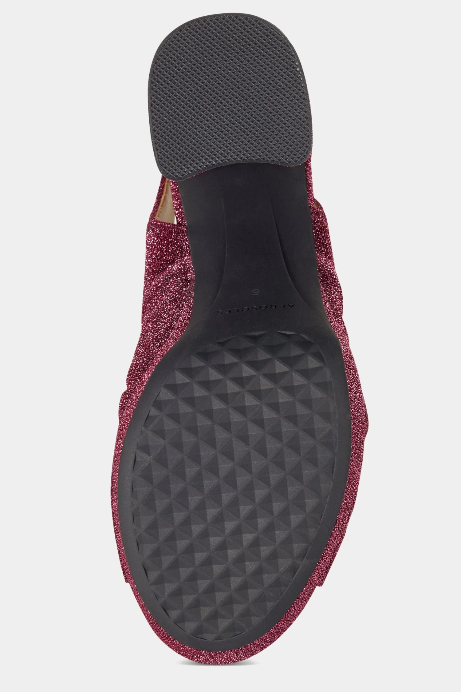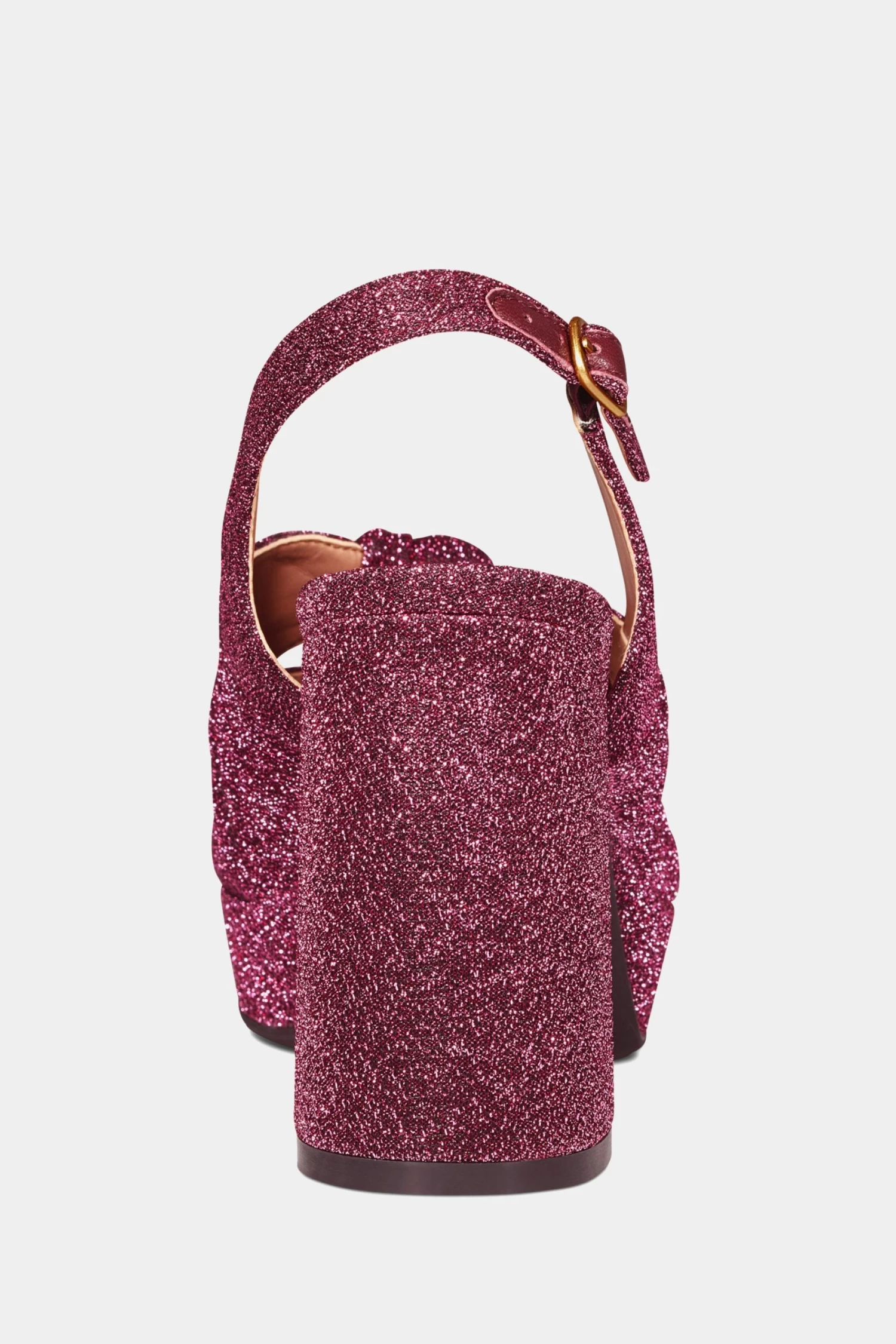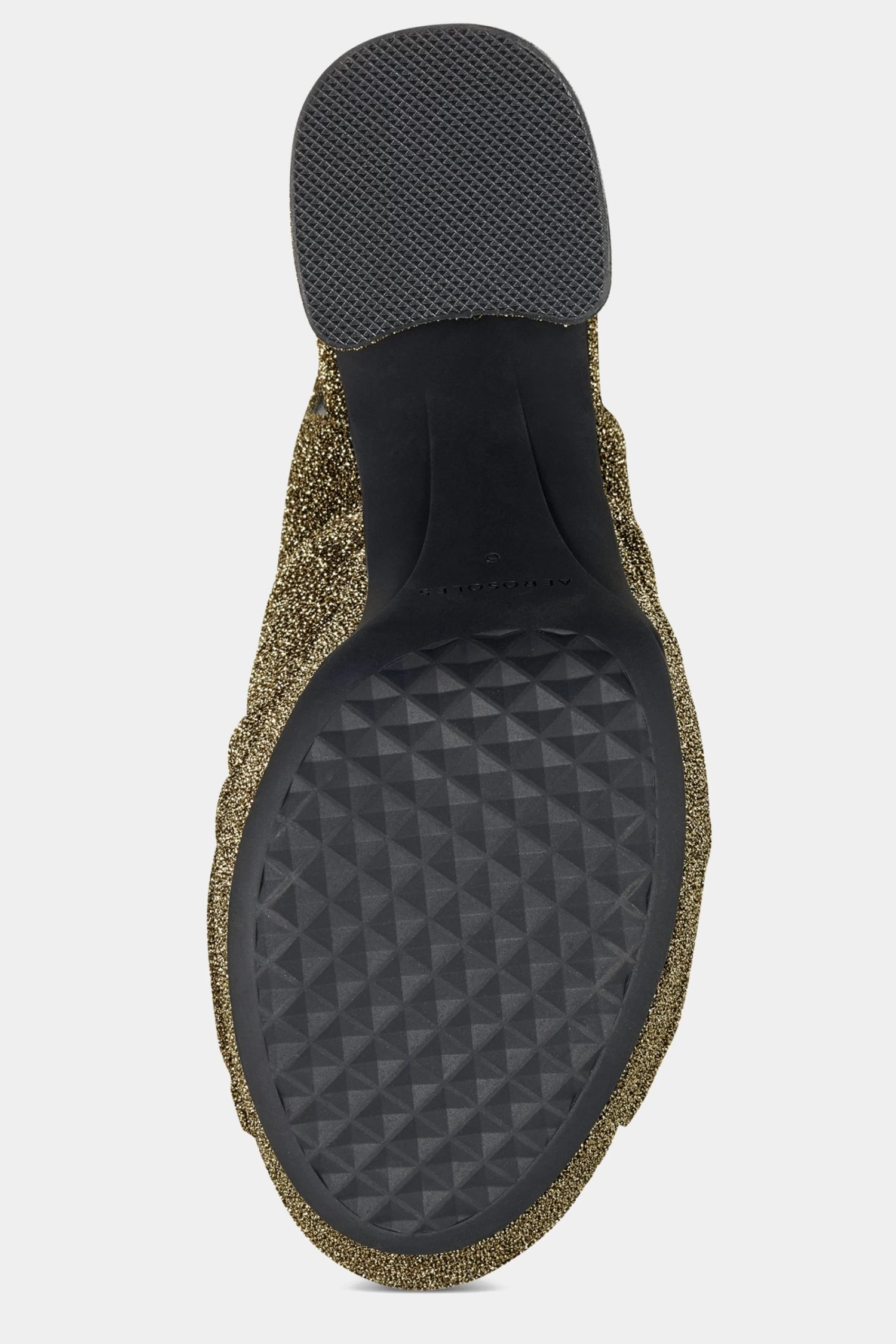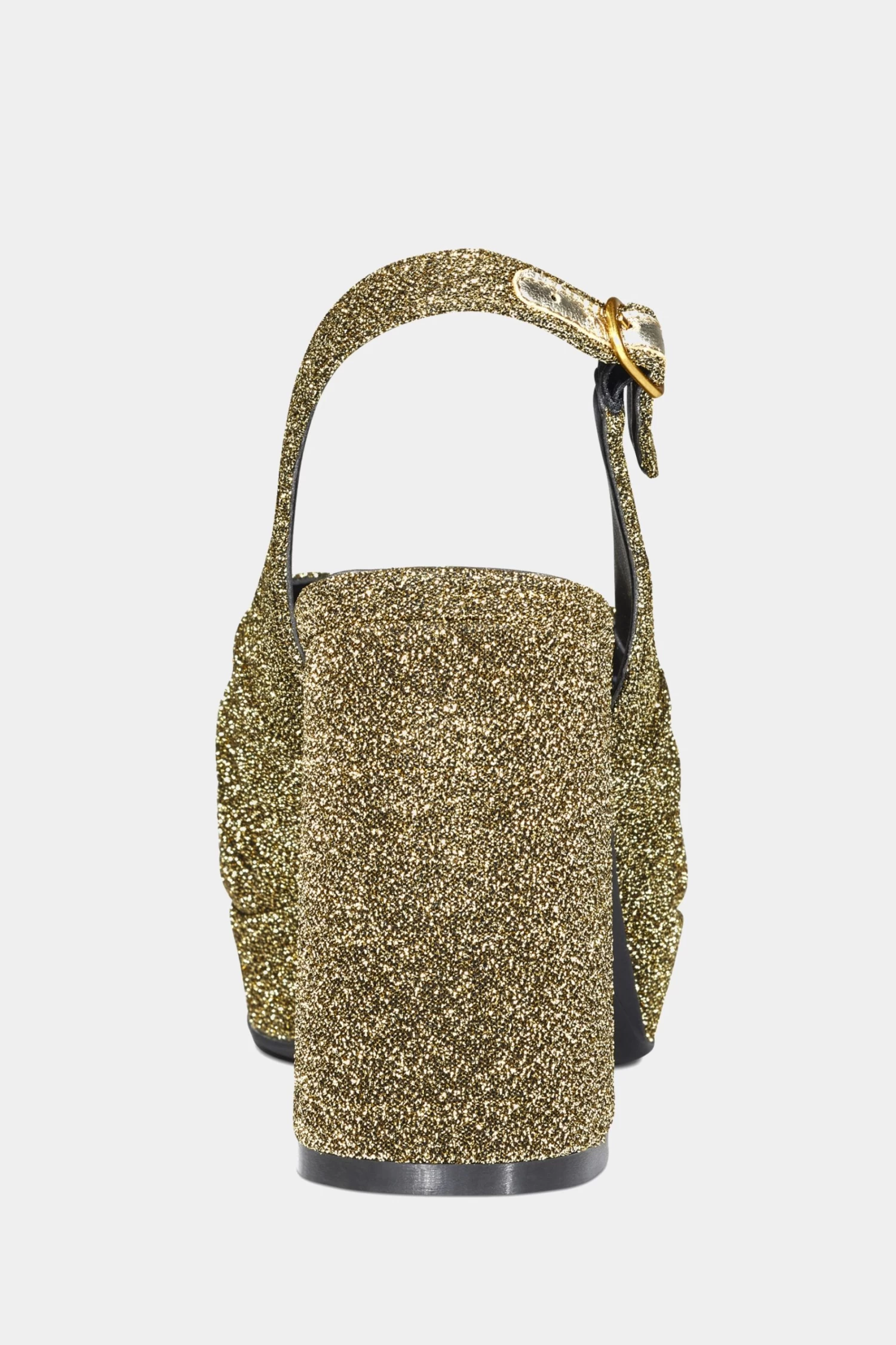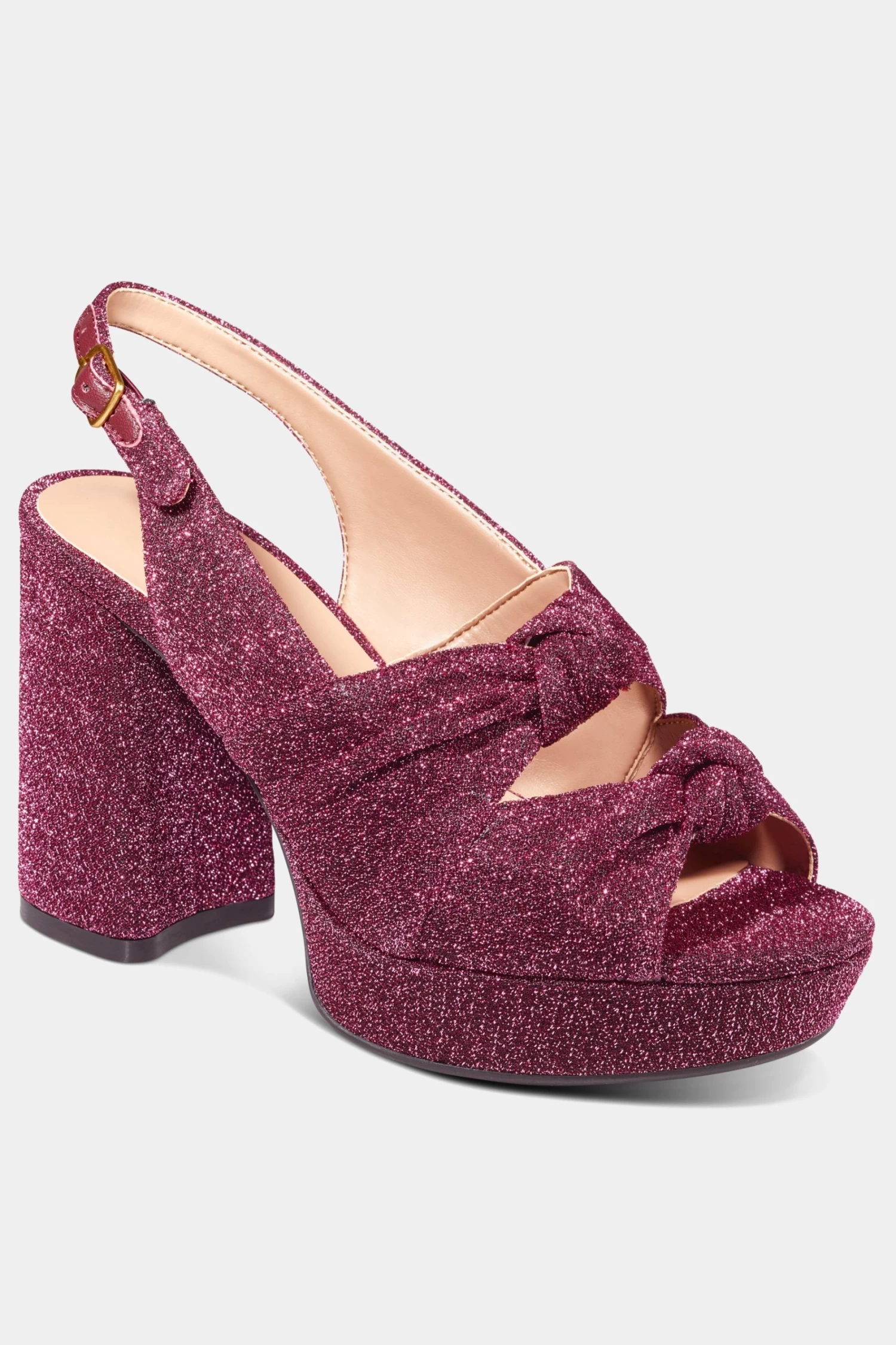 Glittering and ultra glam! Dazzling metallic fabric shines brightly on our Nadia slingback sandal. With a covered block heel and ’70s disco-style platform sole, its double-knotted upper rounds out the look with dimensional detailing.