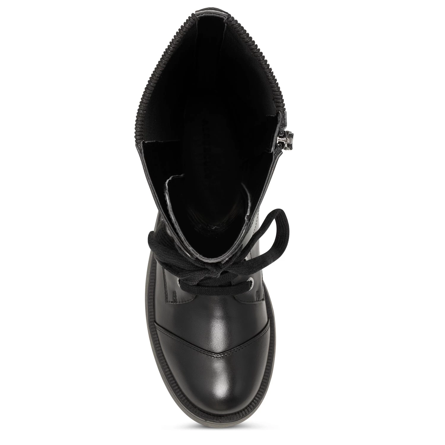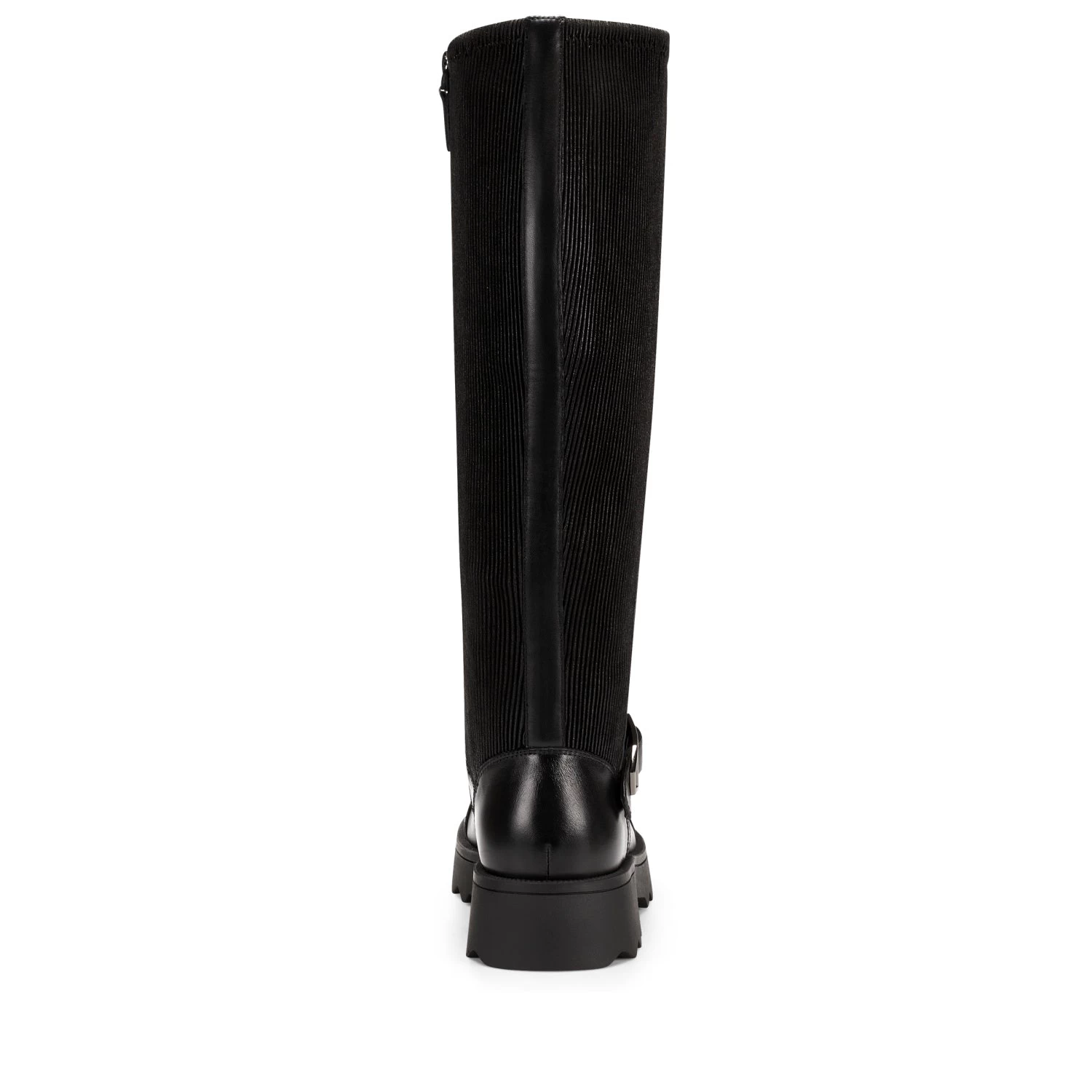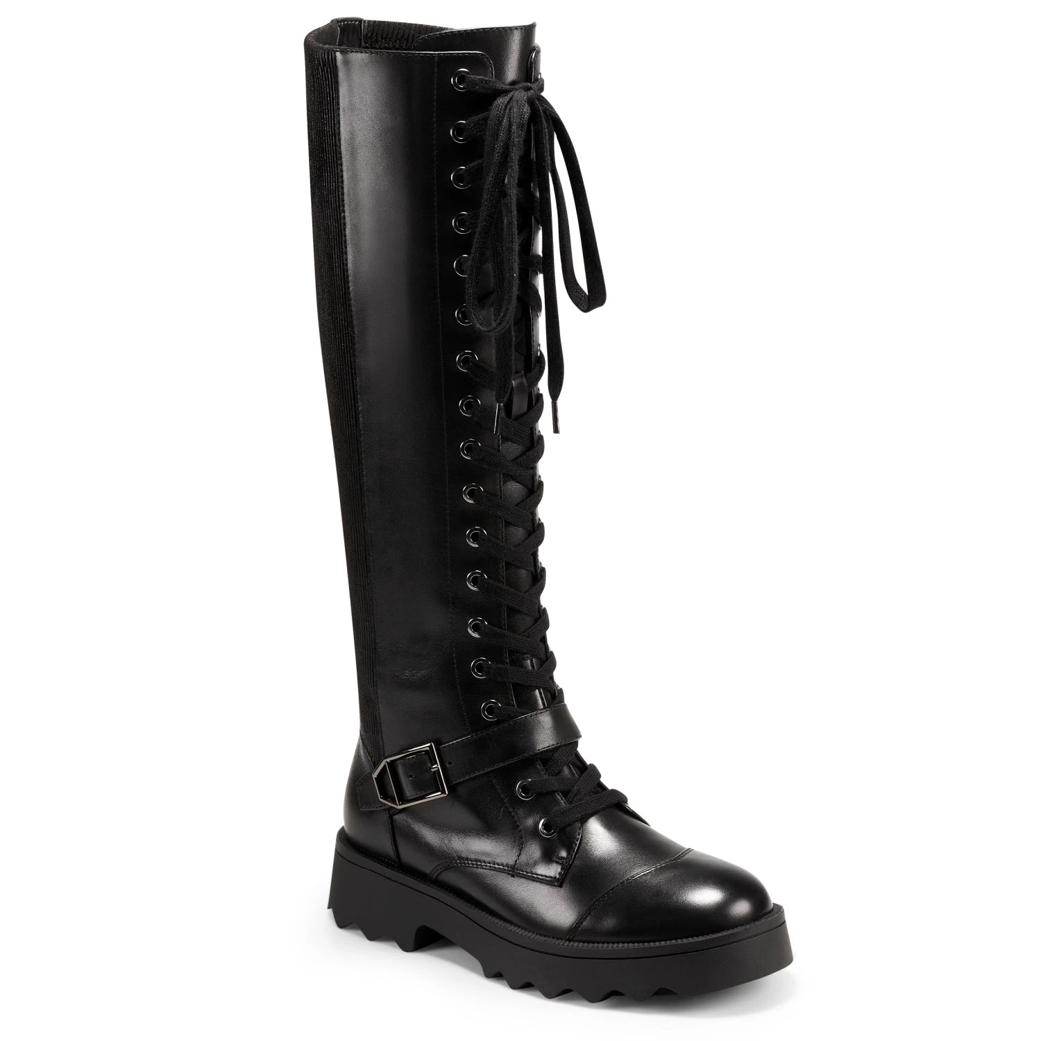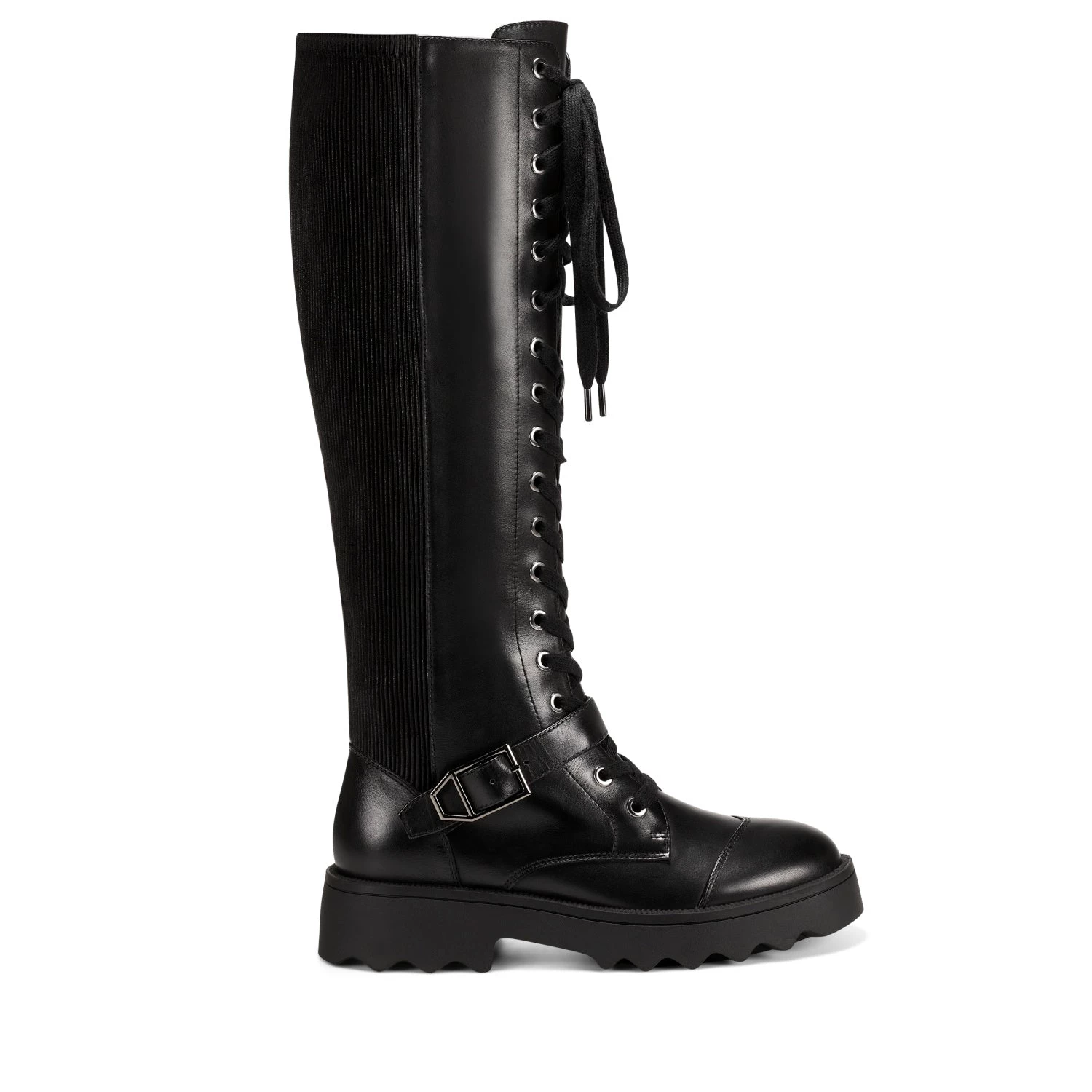 Make strides with a definite downtown edge via the Sondra, our lace-up combat boot crafted in leather. The striking knee-high silhouette complements a sleek pencil skirt and opaque tights. Ribbed elastic material inside the shaft ensures a perfect fit and unsurpassed comfort; the interior zipper adds a sense of ease. Finished with on-trend lug soles. 1 1/2″ Heel. Leather and Elastic Upper, balance Synthetic Materials.
