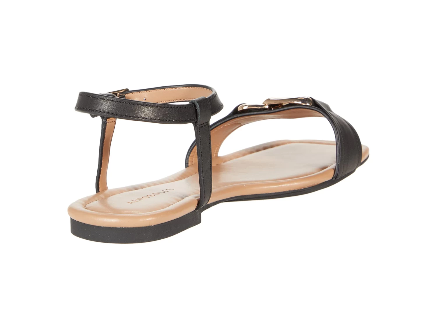 - Leather sandal with open square toe and adjustable buckle closure at the ankle.